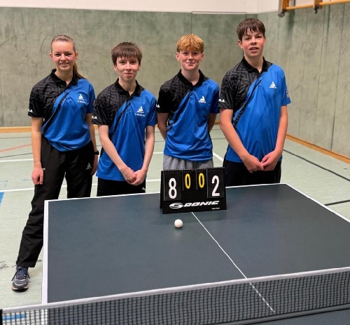 SF Nistertal Tischtennis 1. Jugendmannschaft wird souverän Meister in der Bezirksoberliga Nistertal, 21. November 2025 zurück zum Seitenanfang Die erste Jugendmannschaft um Sebastian, Emma, Linus und Tom hat am vergangenen Wochenende mit einem 10:0 Sieg gegen den Tabellenzweiten aus Weitefeld die Meisterschaft in der Bezirksliga klargemacht. Mit 14:0 Punkten steigen die Vier damit mehr als verdient in die Verbandsliga auf. Herzlichen Glückwunsch!