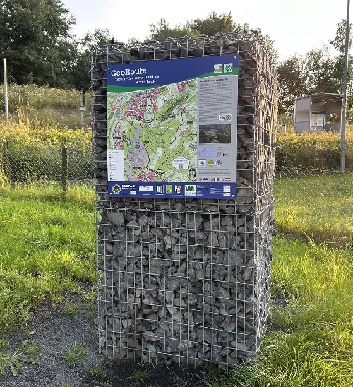Gabionen mit Informationen am Wegesrand der Strecke in Nistertal